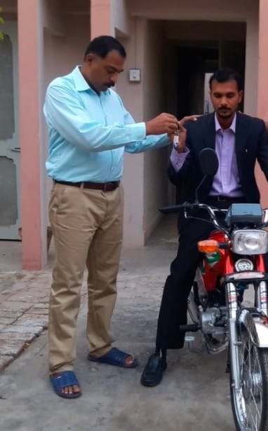 Rev. Bishop Waseem Anjum Bhatti is seen here handing over keys for a newly purchased motorbike to a minister