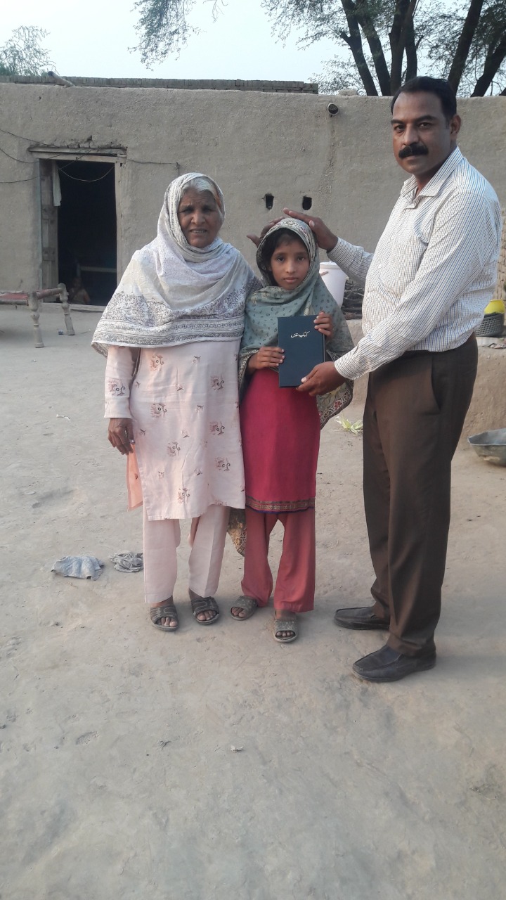 Rev. Bishop Waseem Anjum Bhatti is seen here handing over a bible to a young girl